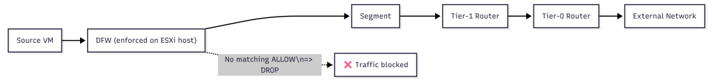 VM -> DFW -> Segment -> Tier-1 -> Tier-0 -> External