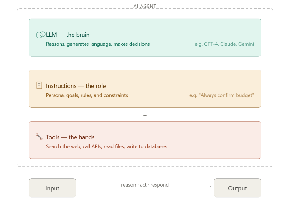 Think of it this way. The LLM (Large Language Model – could be GPT-4, Claude, Llama, Mistral) is the reasoning engine. It’s smart, but on its own it just generates text. The instructions give it a role – like “you are a travel booking assistant, always confirm budget before booking”. The tools give it hands – it can search the web, read files, call APIs, write to databases.