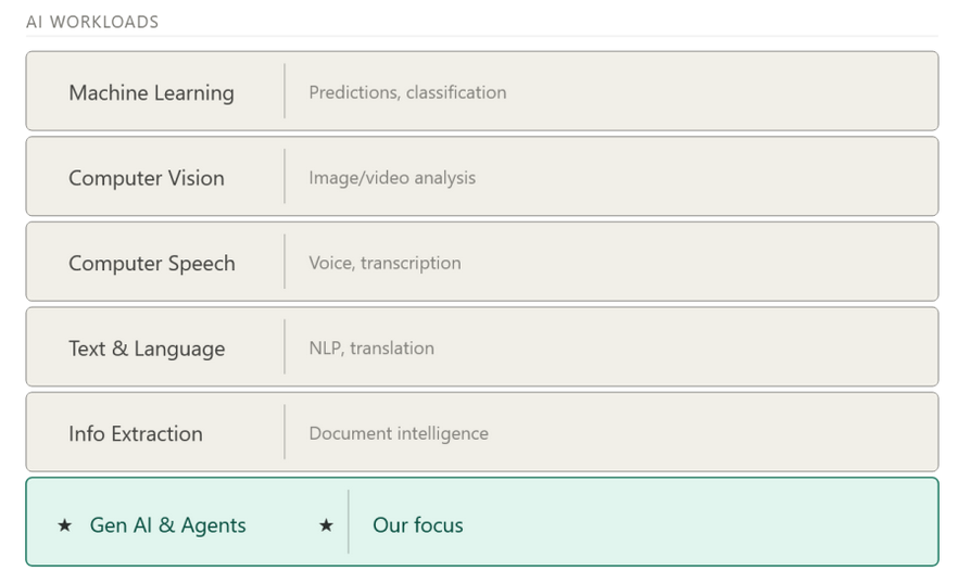 Generative AI and Agents sit at the top of the stack because they orchestrate the others. An agent can call a vision model to analyse an image, then use NLP to summarise findings, then take an action in an external system – all in one workflow.